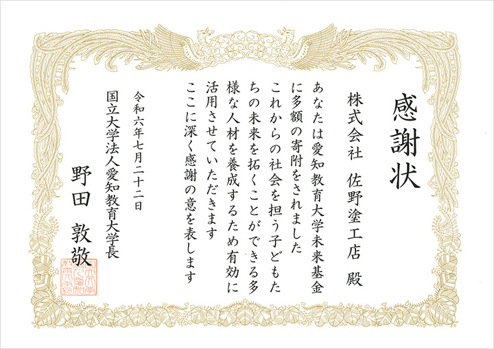株式会社佐野塗工店は、愛知教育大学様の社会を担う子どもたちの未来を拓くことができる多様な人材の養成事業に賛同し、「愛知教育大学未来基金」へ寄付をさせていただきました。